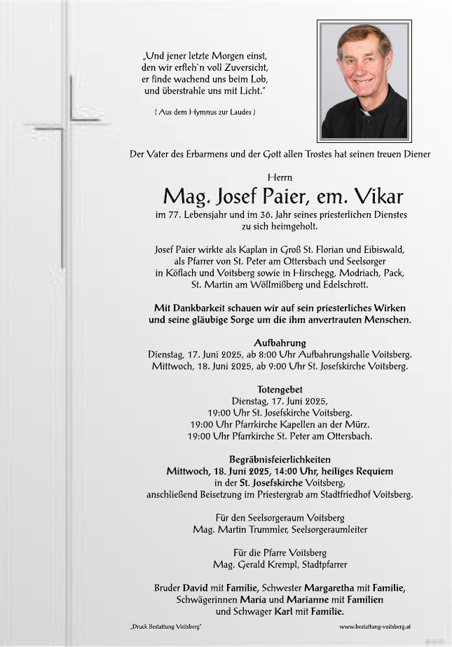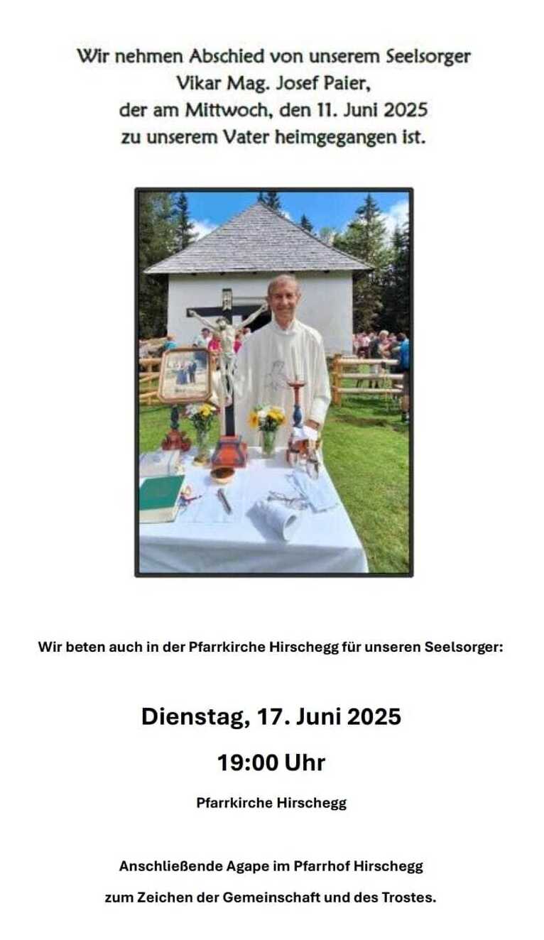 Vikar Mag. Josef Paier, oder wie er in Hirschegg wertschätzend "unser Seppl" genannt wurde, war für uns nicht nur ein Seelsorger, er war ein Mitglied unserer Gemeinschaft. Sei es bei der Freiwilligen Feuerwehr oder beim Musikverein, er war in fröhlichen aber auch traurigen Momenten mit Worten und Taten zur Stelle. Besonders bei den Messen auf der Alm hat er sich besonders wohl und nahe bei Gott gefühlt.